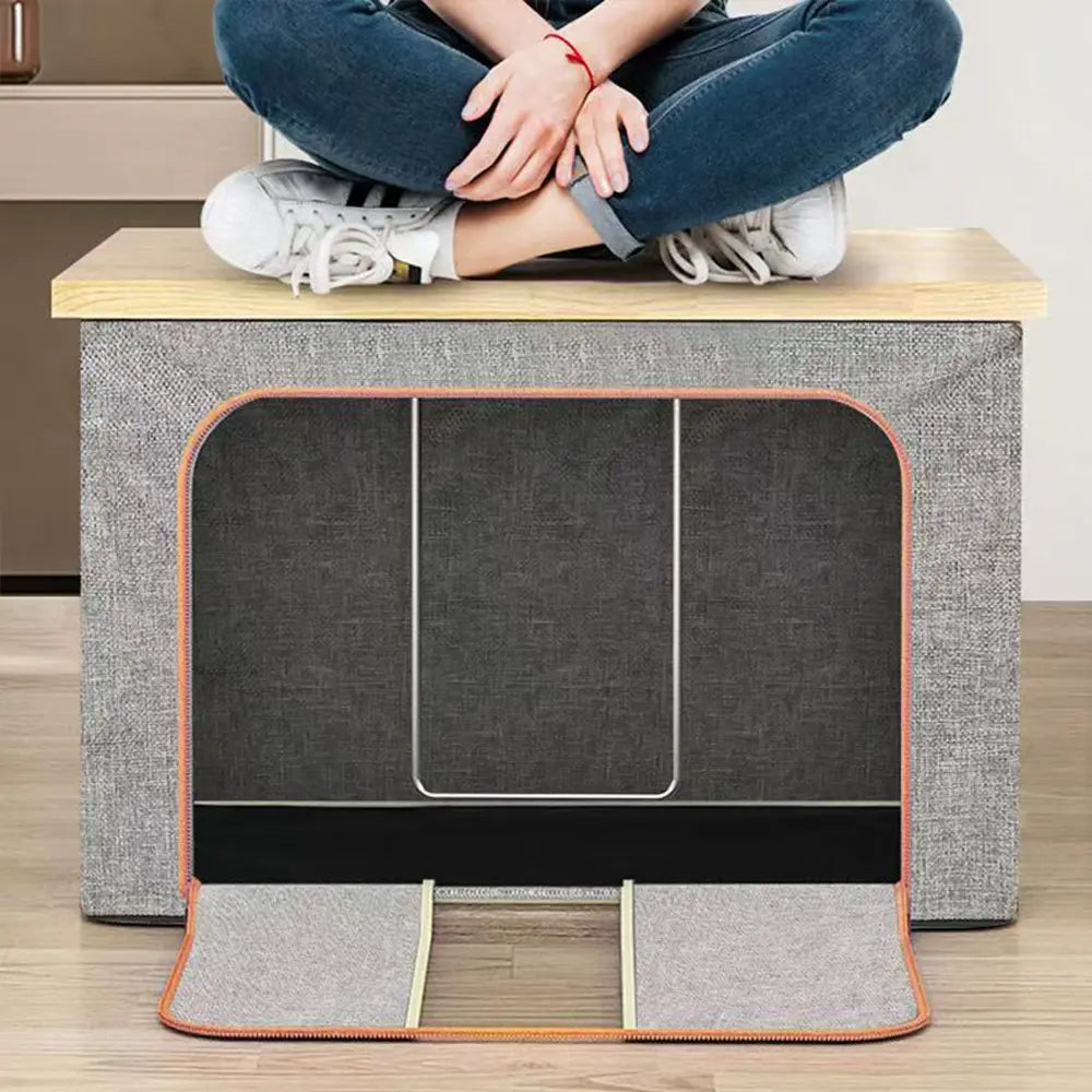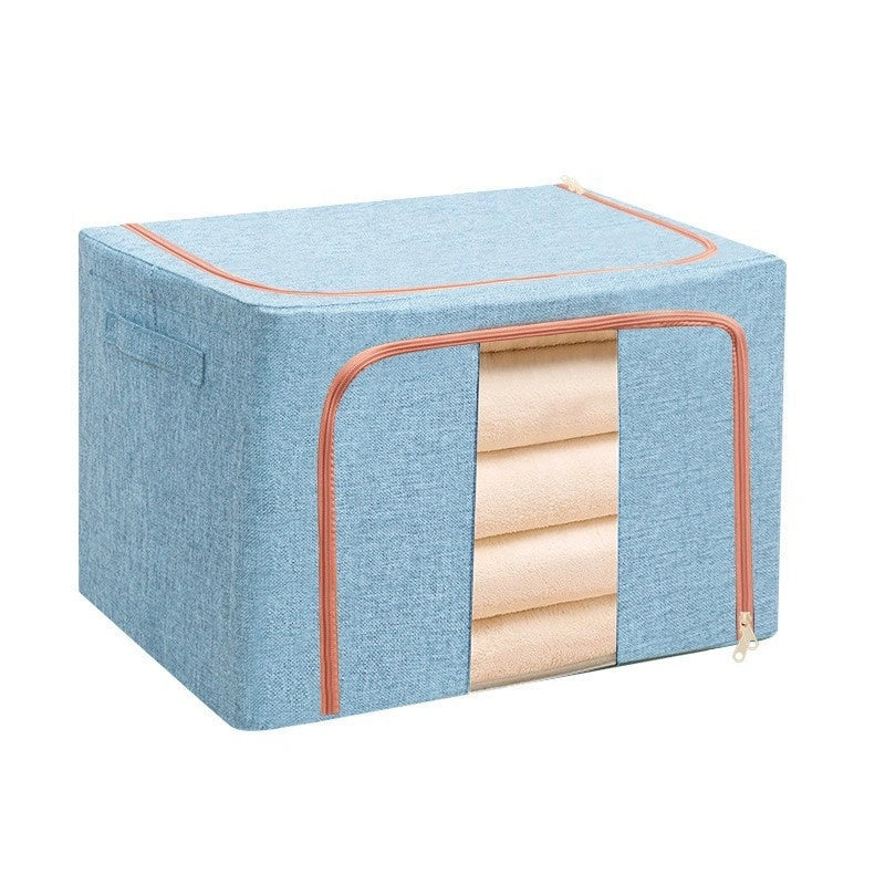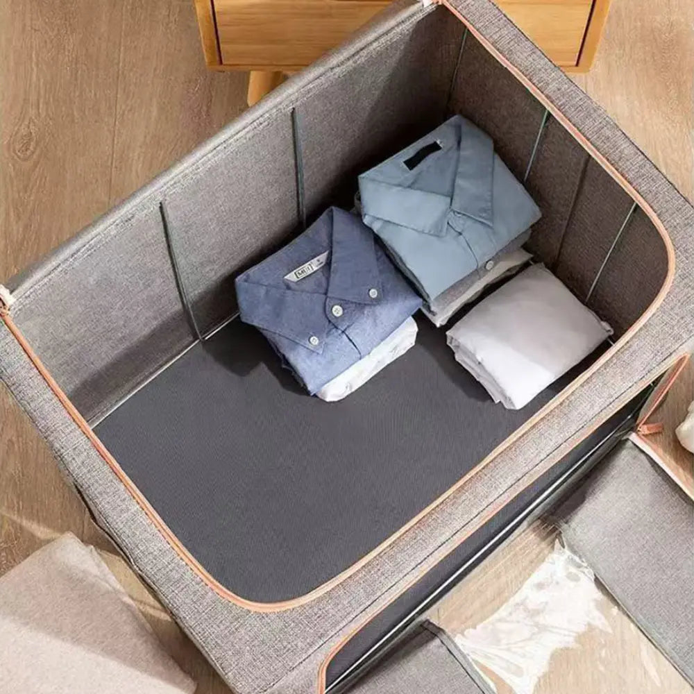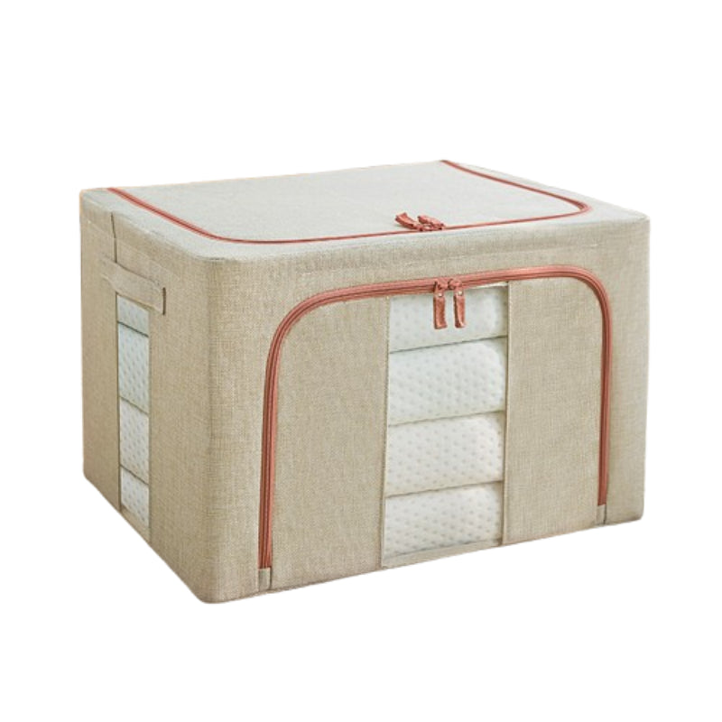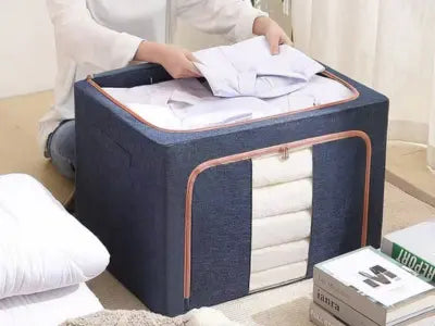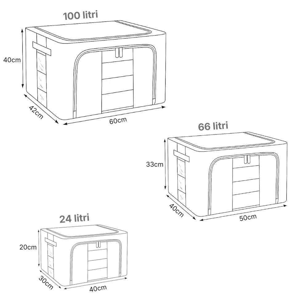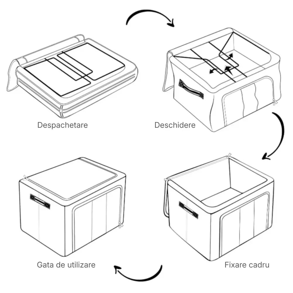 Cutia este pliabila, usoara si compatibila cu orice tip de spatiu: dulap, dressing, sertare, debara, balcon sau sub pat