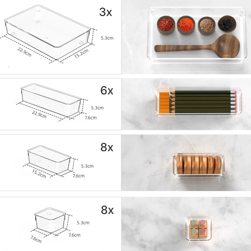 Combina-le exact cum ai nevoie. Datorita celor 4 dimensiuni, organizezi eficient sertare, dulapuri si suprafete deschise, indiferent daca le folosesti in frigider, baie, birou, dormitor sau in zona de cosmetice